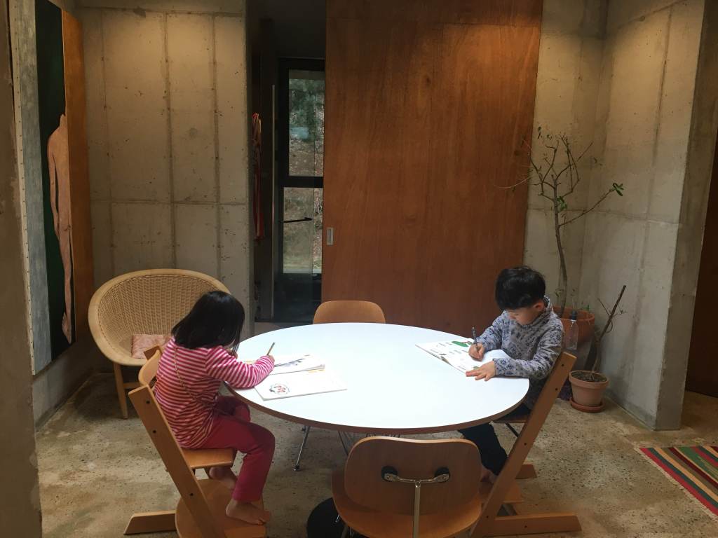 아이들이 책과 연필을 가지고 식탁에 앉았습니다.