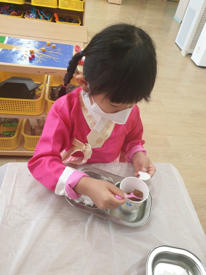 은솔이는 한복을 입고 처음 빚는 송편으로 하트송편을 가득 빚어