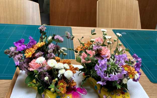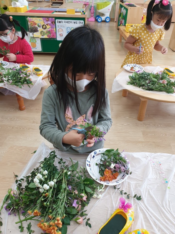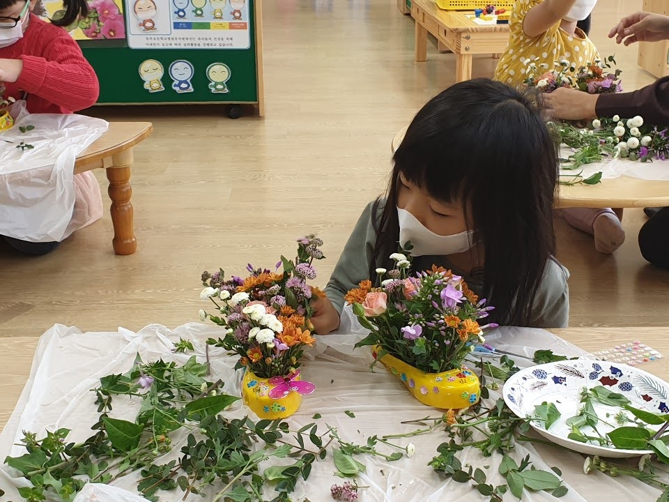 유치원 선생님께서 보내주신 ‘꽃과 함께하는 예술경험의 날’ 수업 사진.