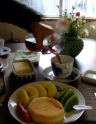 잉글리쉬머핀, 소세지, 키위, 링고, コーヒ